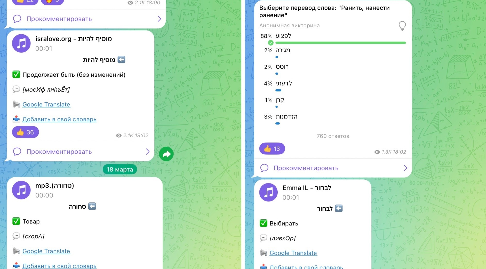 Если вы хотите расширить свой словарный запас иврита без зубрёжки, уделяя этому всего несколько минут в день «между делом», вам стоит обратить внимание на Telegram-канал @ivrit_word – самый большой и самый лучший ресурс для изучения ивритской лексики.